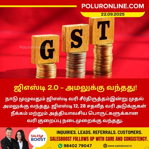 நாடு முழுவதும் ஜிஎஸ்டி வரி சீர்திருத்தம் இன்று முதல் அமலுக்கு வந்தது. ஜிஎஸ்டி 12, 28 சதவீத வரி அடுக்குகள் நீக்கம் மற்றும் அத்தியாவசிய பொருட்களுக்கான வரி குறைப்பு நடைமுறைக்கு வந்தது.