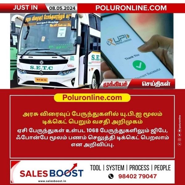 ஏசி பேருந்துகள் உள்பட 1068 பேருந்துகளிலும் ஜிபே, ஃபோன்பே மூலம் பணம் செலுத்தி டிக்கெட் பெறலாம் என அறிவிப்பு.