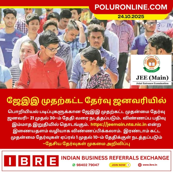 பொறியியல் படிப்புகளுக்கான ஜேஇஇ முதற்கட்ட முதன்மை தேர்வு ஜனவரி- 21 முதல் 30-ம் தேதி வரை நடத்தப்படும். விண்ணப்ப பதிவு இம்மாத இறுதியில் தொடங்கும். https://jeemain.nta.nic.in என்ற இணையதளம் வழியாக விண்ணப்பிக்கலாம். இரண்டாம் கட்ட முதன்மை தேர்வுகள் ஏப்ரல் 1 முதல் 10-ம் தேதிக்குள் நடத்தப்படும் என தேசிய தேர்வுகள் முகமை அறிவித்துள்ளது.