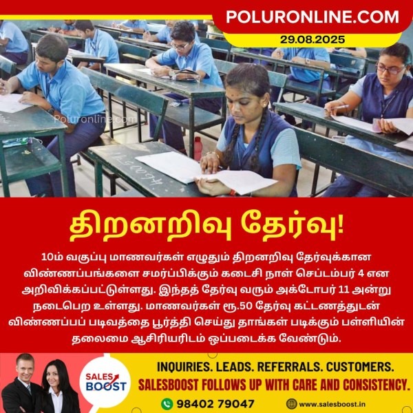 10ம் வகுப்பு மாணவர்கள் எழுதும் திறனறிவு தேர்வுக்கான விண்ணப்பங்களை சமர்ப்பிக்கும் கடைசி நாள் செப்டம்பர் 4 என அறிவிக்கப்பட்டுள்ளது. இந்தத் தேர்வு வரும் அக்டோபர் 11 அன்று நடைபெற உள்ளது. மாணவர்கள் ரூ.50 தேர்வு கட்டணத்துடன் விண்ணப்பப் படிவத்தை பூர்த்தி செய்து தாங்கள் படிக்கும் பள்ளியின் தலைமை ஆசிரியரிடம் ஒப்படைக்க வேண்டும்.