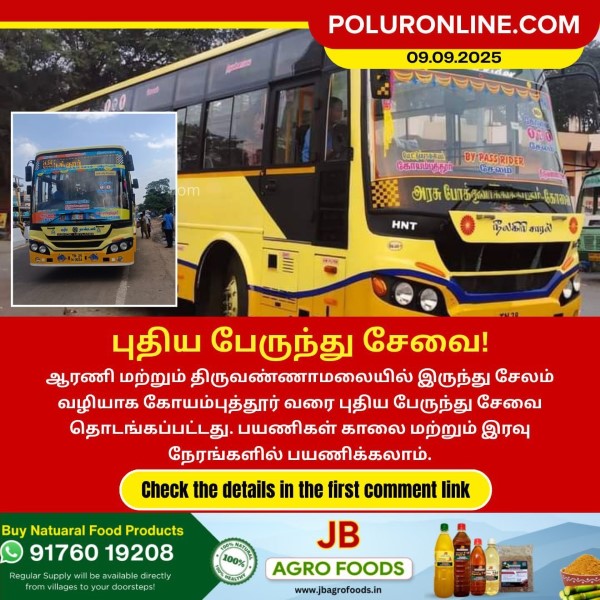 ஆரணி, போளூர்,செங்கம், திருவண்ணாமலை, ஊத்தங்கரை, சேலம் வழியாக கோயம்புத்தூர் செல்லும் புதிய காலை மற்றும் இரவு நேர பேருந்து சேவை தொடங்கப்பட்டுள்ளது. பயணிகளின் வசதிக்காக இந்த சேவை தினமும் இயக்கப்படும்.