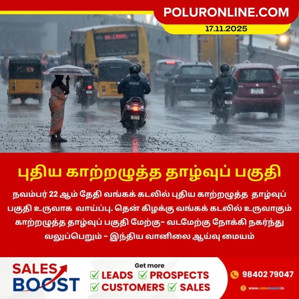 நவம்பர் 22 ஆம் தேதி வங்கக் கடலில் புதிய காற்றழுத்த தாழ்வுப் பகுதி உருவாக வாய்ப்பு. தென் கிழக்கு வங்கக் கடலில் உருவாகும் காற்றழுத்த தாழ்வுப் பகுதி மேற்கு- வடமேற்கு நோக்கி நகர்ந்து வலுப்பெறும் என இந்திய வானிலை ஆய்வு மையம் தெரிவித்துள்ளது.