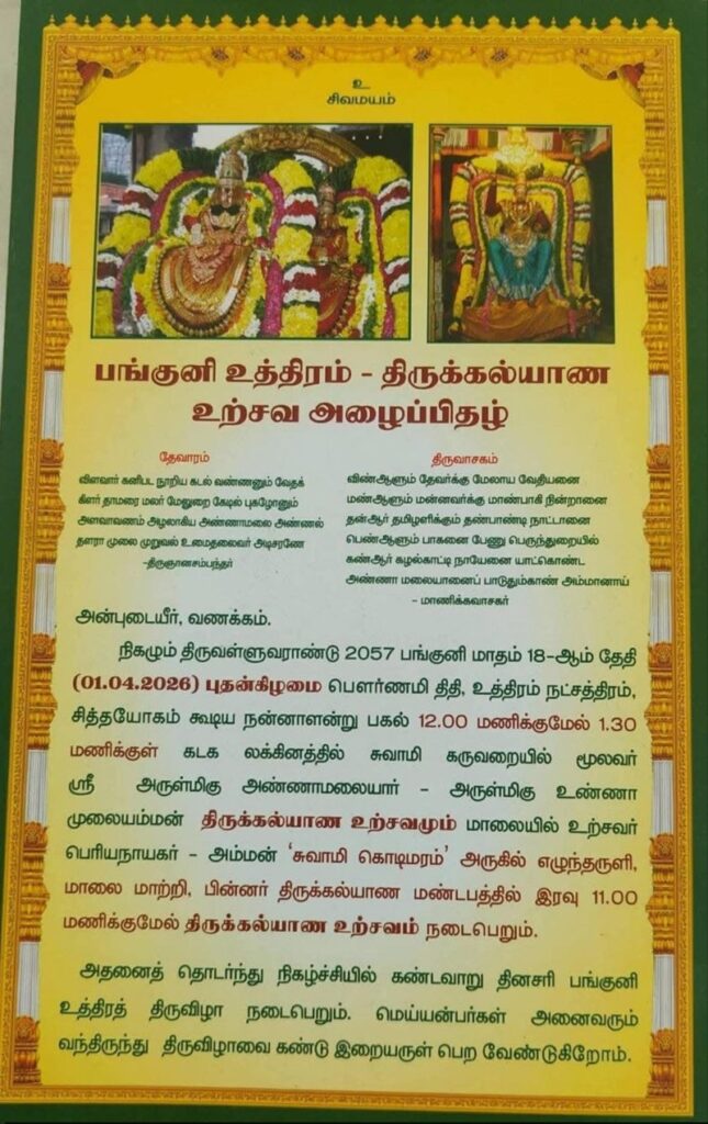 திருவண்ணாமலை அருணாசலேஸ்வரர் திருக்கோவிலில், ஆண்டுதோறும் வெகு விமர்சையாக நடைபெறும் பங்குனி உத்திரம் திருக்கல்யாண உற்சவம், இந்தாண்டு 01.04.2025 முதல் 06.04.2025 வரை நடைபெற உள்ளது.