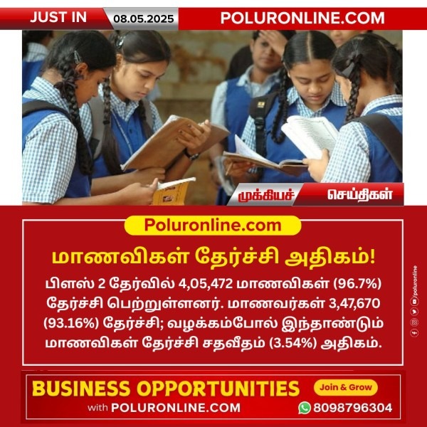 பிளஸ் 2 தேர்வில் 4,05,472 மாணவிகள் (96.7%) தேர்ச்சி பெற்றுள்ளனர். மாணவர்கள் 3,47,670 (93.16%) தேர்ச்சி, வழக்கம்போல் இந்தாண்டும் மாணவிகள் தேர்ச்சி சதவீதம் (3.54%) அதிகம்.