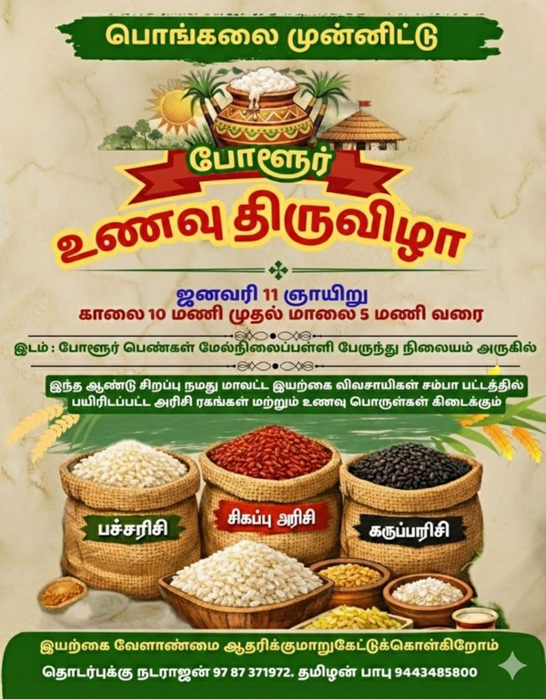 போளூர் பெண்கள் மேல்நிலைப்பள்ளி பேருந்து நிலையம் அருகில் நடைபெறும் இந்த உணவு திருவிழாவில், அரிசி ரகங்கள் குறித்து விளக்கம் அளிக்கும் வகையில் சிறப்பு ஏற்பாடுகளும் செய்யப்பட்டுள்ளன. பொதுமக்கள், வியாபாரிகள் மற்றும் அரிசி வாங்க விரும்பும் அனைவரும் இதில் கலந்து கொண்டு பயன்பெறலாம்