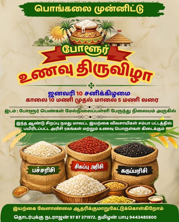 பொங்கல் பண்டிகையை முன்னிட்டு போளூரில் “உணவு திருவிழா” சிறப்பாக நடைபெற உள்ளது. இந்த திருவிழா ஜனவரி 10 சனிக்கிழமை காலை 10 மணி முதல் மாலை 5 மணி வரை நடைபெறும்.