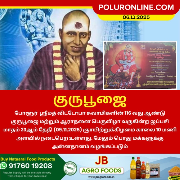போளூர் ஸ்ரீமத் விட்டோபா சுவாமிகளின் 116 வது ஆண்டு குருபூஜை மற்றும் ஆராதனை பெருவிழா வருகின்ற ஐப்பசி மாதம் 23ஆம் தேதி (09.11.2025) ஞாயிற்றுக்கிழமை காலை 10 மணி அளவில் நடைபெற உள்ளது. மேலும் பொது மக்களுக்கு அன்னதானம் வழங்கப்படும்