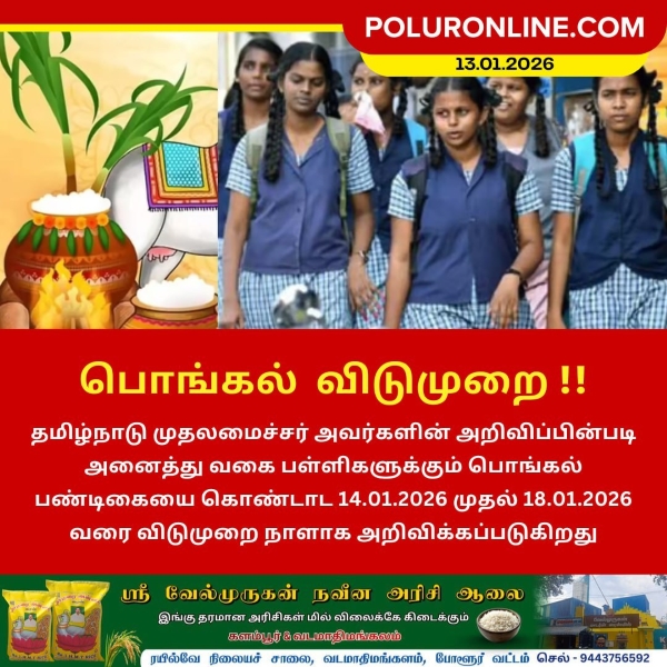 தமிழ்நாடு முதலமைச்சர் அவர்களின் அறிவிப்பின்படி, அனைத்து வகை பள்ளிகளுக்கும் பொங்கல் பண்டிகையை முன்னிட்டு 14.01.2026 முதல் 18.01.2026 வரை விடுமுறை நாள்களாக அறிவிக்கப்பட்டுள்ளது