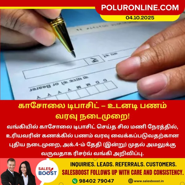வங்கியில் காசோலை டிபாசிட் செய்த சில மணி நேரத்தில், உரியவரின் கணக்கில் பணம் வரவு வைக்கப்படுவதற்கான புதிய நடைமுறை, அக்டோபர் 4-ம் தேதி (இன்று) முதல் அமலுக்கு வருவதாக ரிசர்வ் வங்கி அறிவித்துள்ளது.
