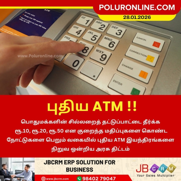 பொதுமக்களின் சில்லறைத் தட்டுப்பாட்டை தீர்க்க ரூ.10, ரூ.20, ரூ.50 என குறைந்த மதிப்புகளை கொண்ட நோட்டுகளை பெறும் வகையில் புதிய ATM இயந்திரங்களை நிறுவ ஒன்றிய அரசு திட்டமிட்டுள்ளது.