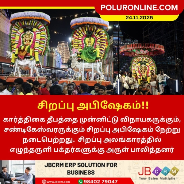 கார்த்திகை தீபத்தை முன்னிட்டு, விநாயகருக்கும் சண்டிகேஸ்வரருக்கும் நேற்று சிறப்பு அபிஷேகம் நடைபெற்றது. பின்னர், இருவரும் சிறப்பு அலங்காரத்தில் எழுந்தருளி பக்தர்களுக்கு அருள் பாலித்தனர்.