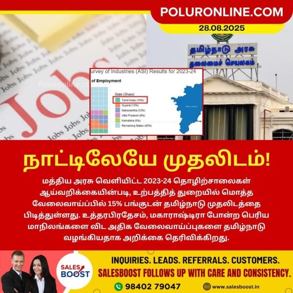 மத்திய அரசு வெளியிட்ட 2023-24 தொழிற்சாலைகள் ஆய்வறிக்கையின்படி, உற்பத்தித் துறையில் மொத்த வேலைவாய்ப்பில் 15% பங்குடன் தமிழ்நாடு முதலிடத்தை பிடித்துள்ளது. உத்தரபிரதேசம், மகாராஷ்டிரா போன்ற பெரிய மாநிலங்களை விட அதிக வேலைவாய்ப்புகளை தமிழ்நாடு வழங்கியதாக அறிக்கை தெரிவிக்கிறது.