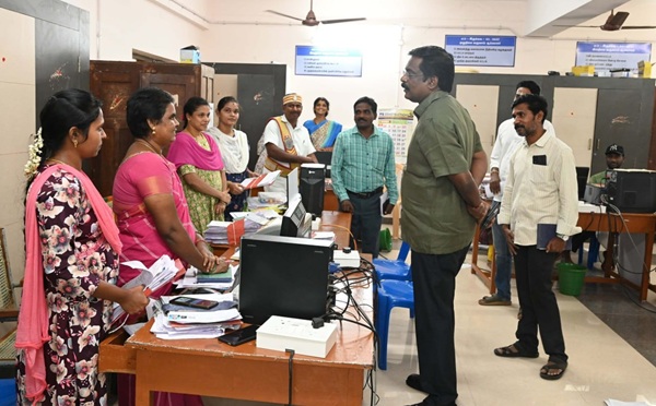 திருவண்ணாமலை மாவட்ட ஆட்சித்தலைவர் திரு. க. தர்ப்பகராஜ் அவர்கள் நேற்று (19.11.2025) போளூர் வட்டாட்சியர் அலுவலகத்தை பார்வையிட்டார். வாக்காளர் பட்டியல் சிறப்பு தீவிர திருத்தம் நடைபெறுவதை முன்னிட்டு, வாக்காளர் படிவ விவரங்களை செயலியில் பதிவேற்றும் பணியின் முன்னேற்றத்தை அவர் நேரில் ஆய்வு செய்தார்.