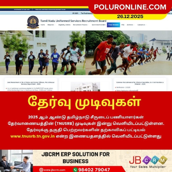 2025 ஆம் ஆண்டு தமிழ்நாடு சீருடைப் பணியாளர்கள் தேர்வாணையத்தின் (TNUSRB) முடிவுகள் இன்று வெளியிடப்பட்டுள்ளன. தேர்வுக்கு தகுதி பெற்றவர்களின் தற்காலிகப் பட்டியல் www.tnusrb.tn.gov.in என்ற இணையதளத்தில் வெளியிடப்பட்டுள்ளது.