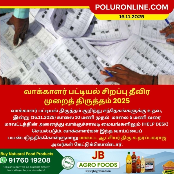 வாக்காளர் பட்டியல் திருத்தம் குறித்து சந்தேகங்களுக்கு உதவ, இன்று (16.11.2025) காலை 10 மணி முதல் மாலை 5 மணி வரை மாவட்டத்தின் அனைத்து வாக்குச்சாவடி மையங்களிலும் HELP DESK செயல்படும். வாக்காளர்கள் இந்த வாய்ப்பைப் பயன்படுத்திக்கொள்ளுமாறு மாவட்ட ஆட்சியர் திரு.க.தர்ப்பகராஜ் அவர்கள் கேட்டுக்கொண்டார்.