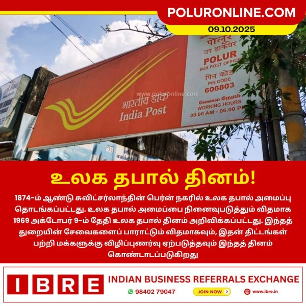 1874-ம் ஆண்டு சுவிட்சர்லாந்தின் பெர்ன் நகரில் உலக தபால் அமைப்பு தொடங்கப்பட்டது. உலக தபால் அமைப்பை நினைவுபடுத்தும் விதமாக 1969 அக்டோபர் 9-ம் தேதி உலக தபால் தினம் அறிவிக்கப்பட்டது. இந்தத் துறையின் சேவைகளைப் பாராட்டும் விதமாகவும், இதன் திட்டங்கள் பற்றி மக்களுக்கு விழிப்புணர்வு ஏற்படுத்தவும் இந்தத் தினம் கொண்டாடப்படுகிறது.